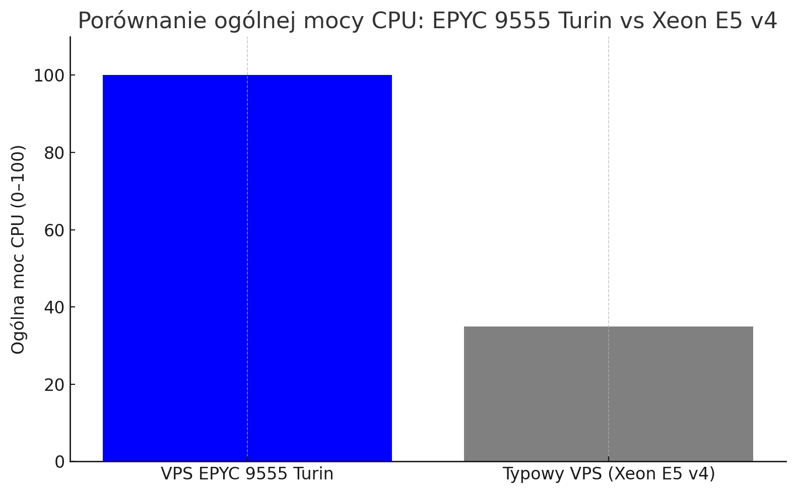 | Parametr | VPS EPYC (AMD EPYC 9555 Turin) | Typowy VPS (Intel Xeon E5 v4) |