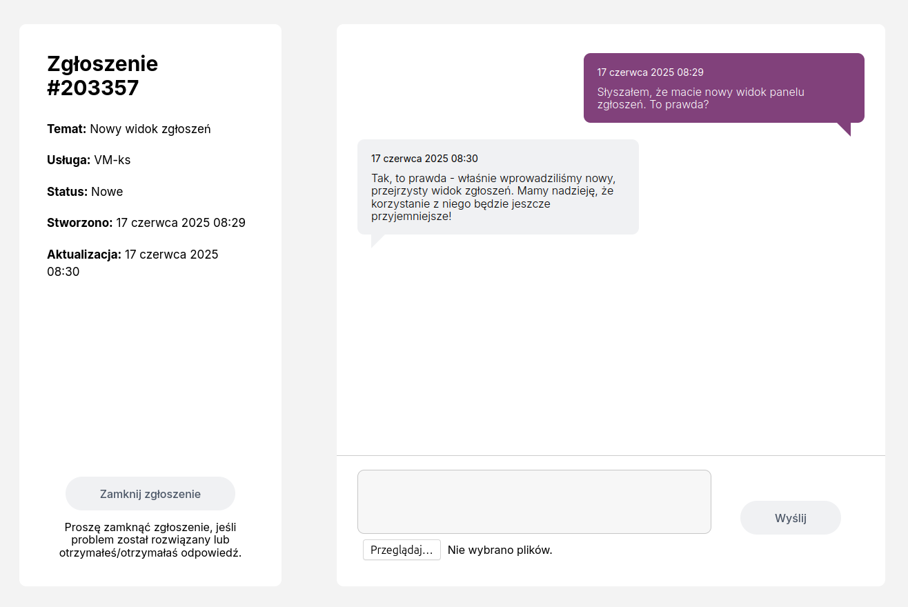 • Przejrzysty widok zgłoszeń — łatwiej odnajdziesz historię rozmów i aktualny status zgłoszenia.